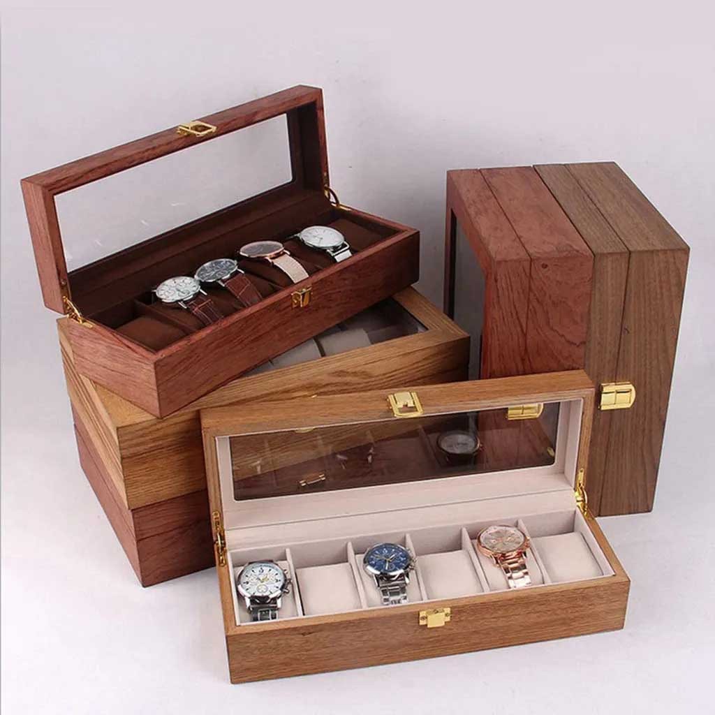 Includes: 1 Piece 6 Slots Wood Watch Display Locking Case