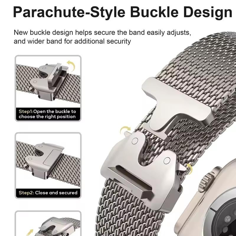 Parachute-style buckle with Milanese Loop ensures a secure fit. Infinitely adjustable mesh loop provides optimal comfort, similar to iWatch’s Titanium Milanese Loop Band.✔ Compatibility: